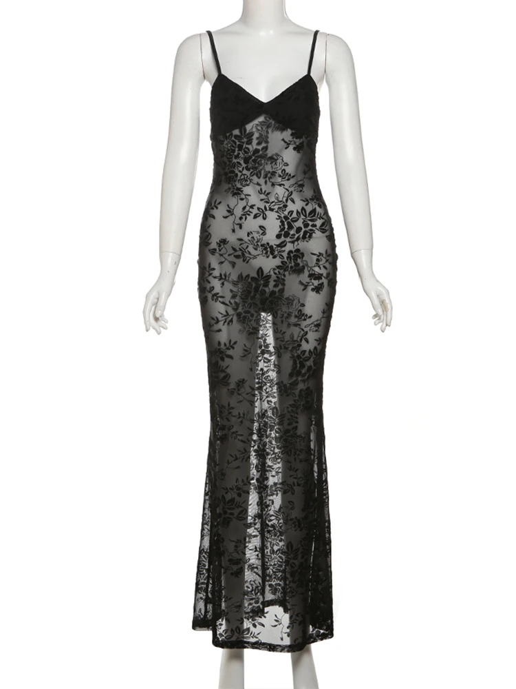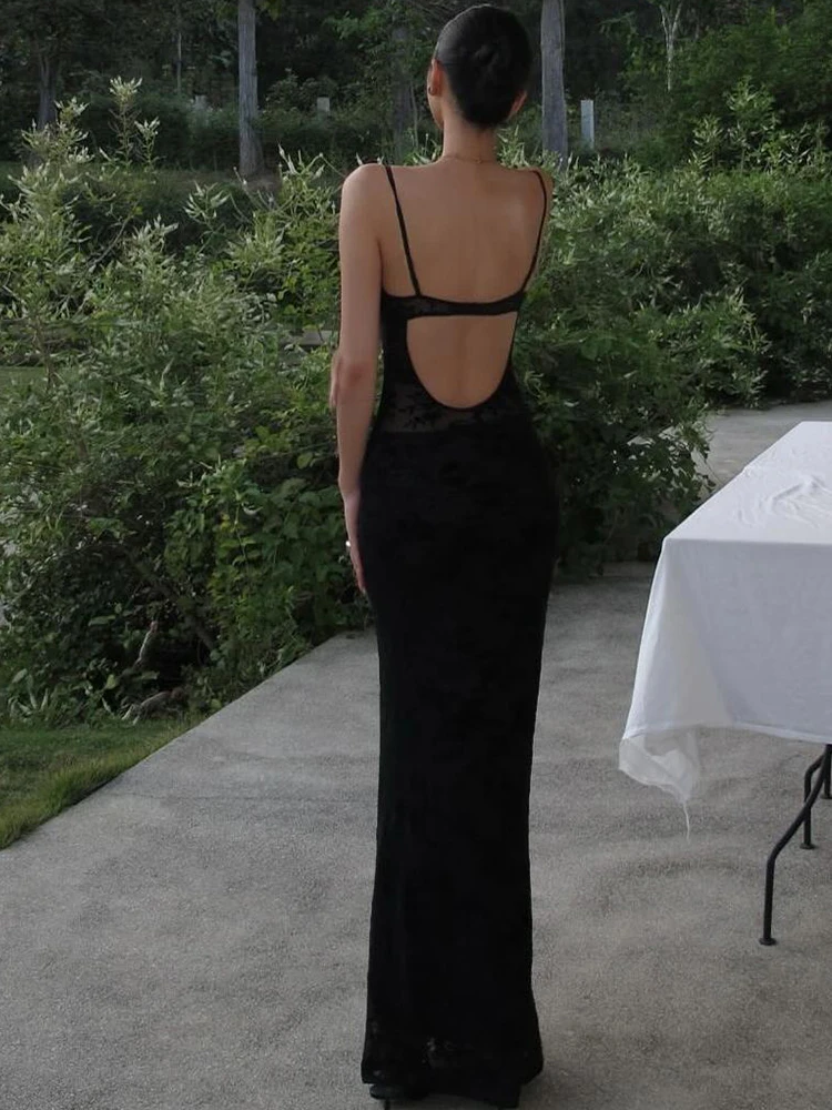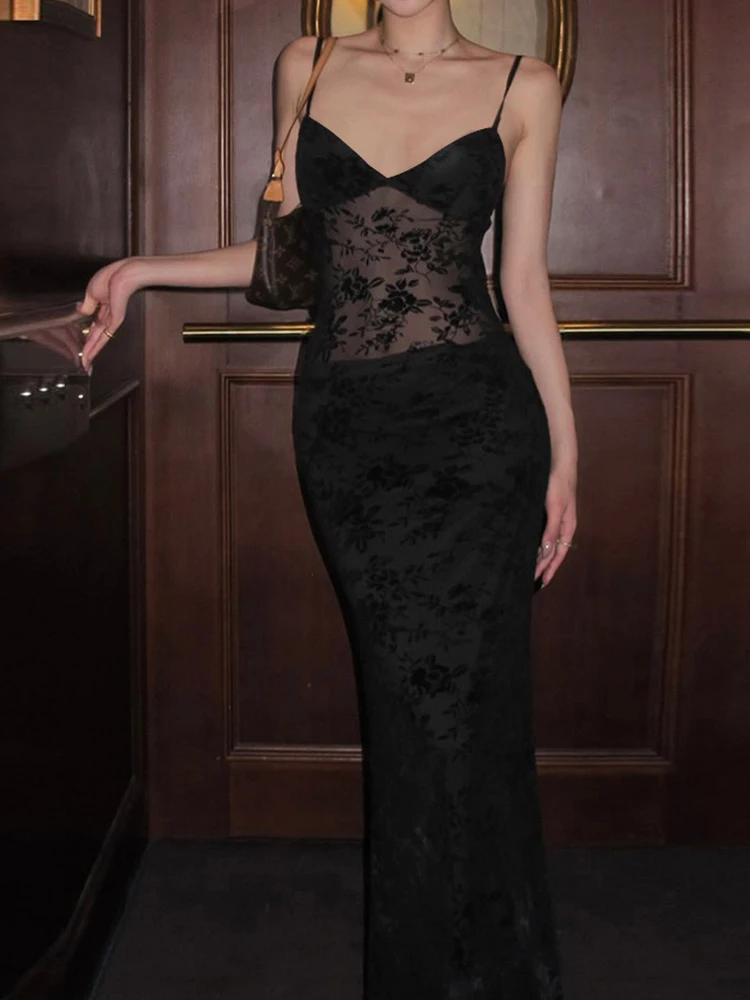 Abito lungo Sisterlinda con scollo a V in pizzo, sexy e seducente, con spalline sottili sulla schiena, tubino trasparente e splendido abito da festa.
