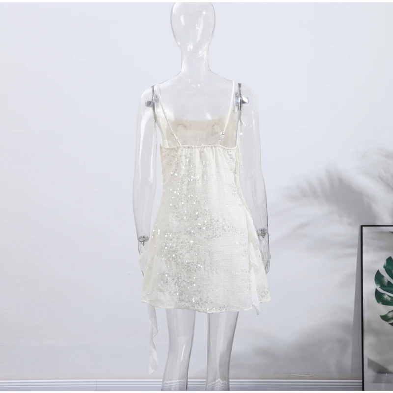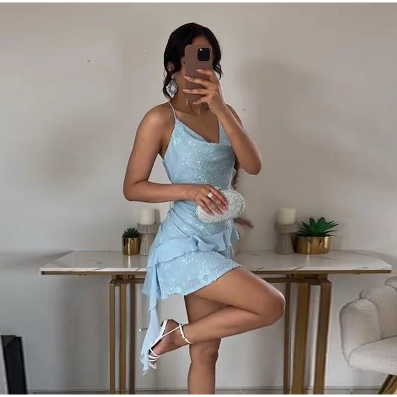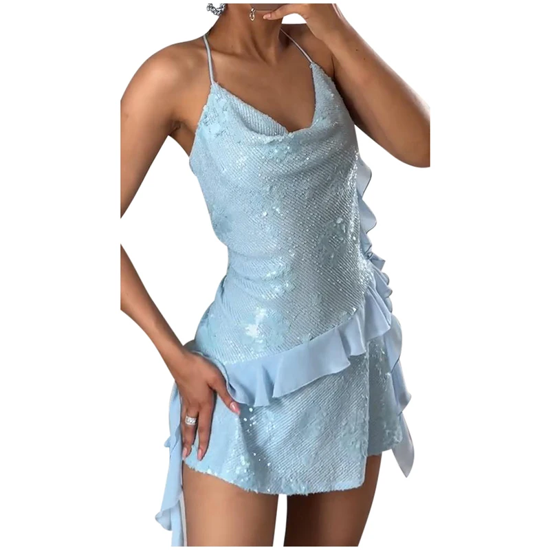 Mini abito con paillettes e volant da donna, abito sottoveste slim con scollo a cascata, senza schienale, estivo, per vacanze, spiaggia, club, feste, abito corto tinta unita da donna